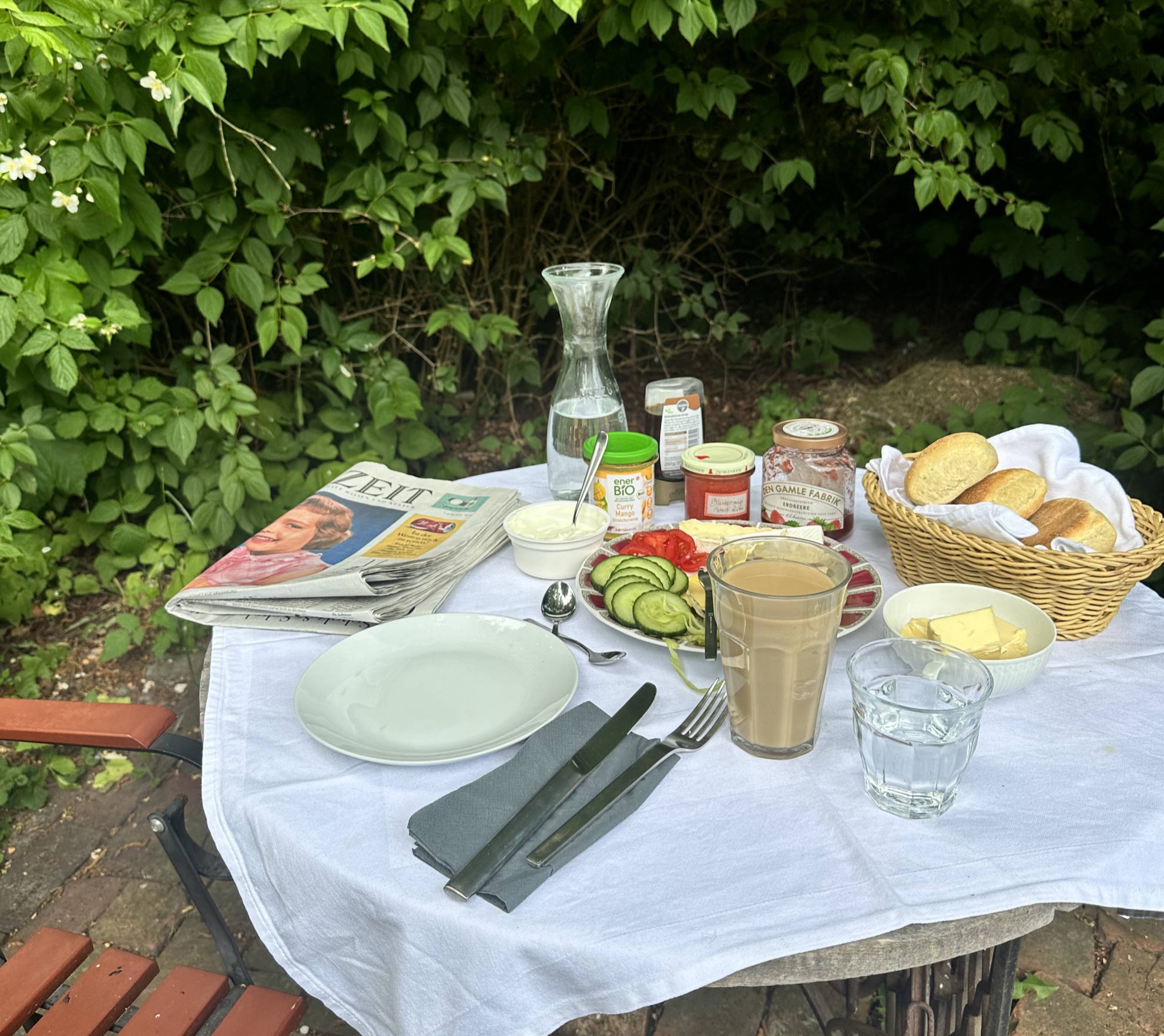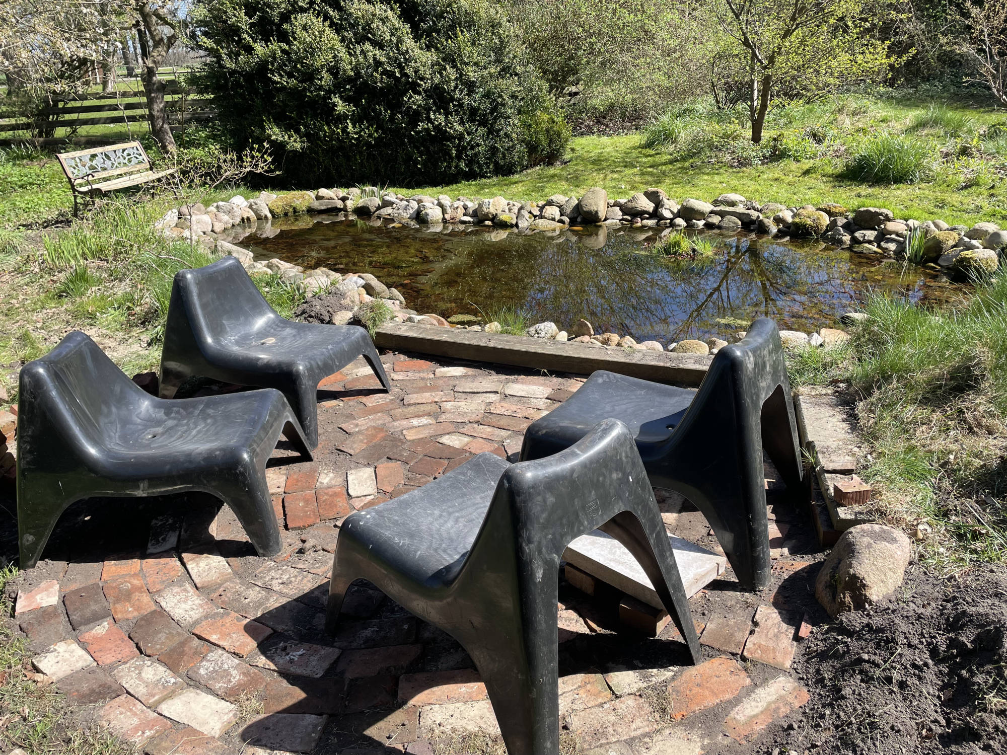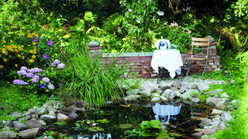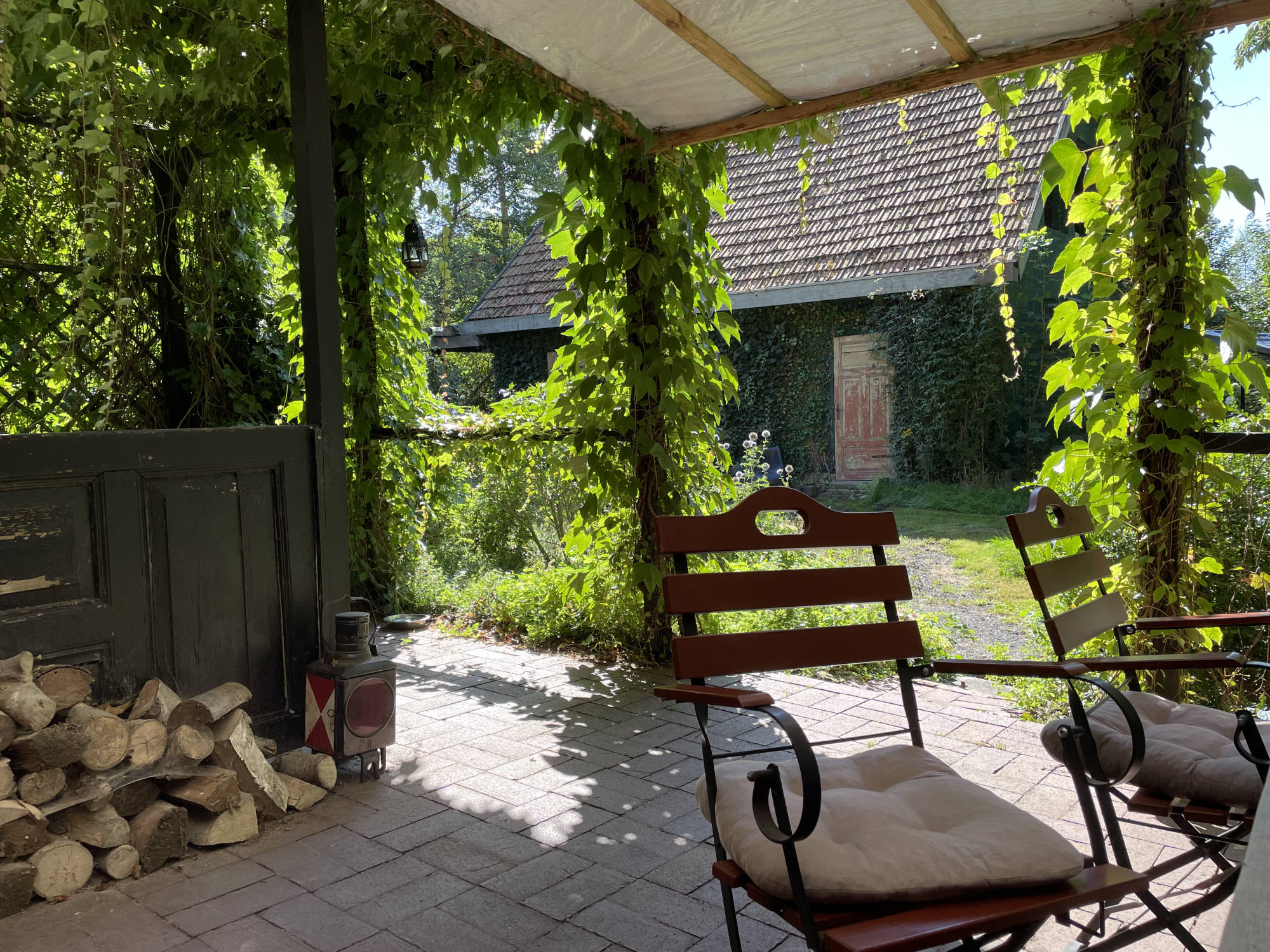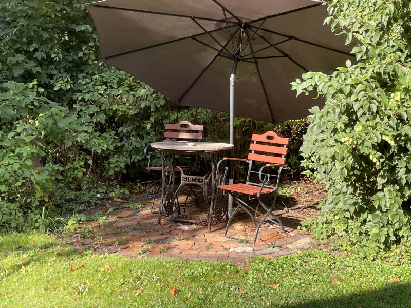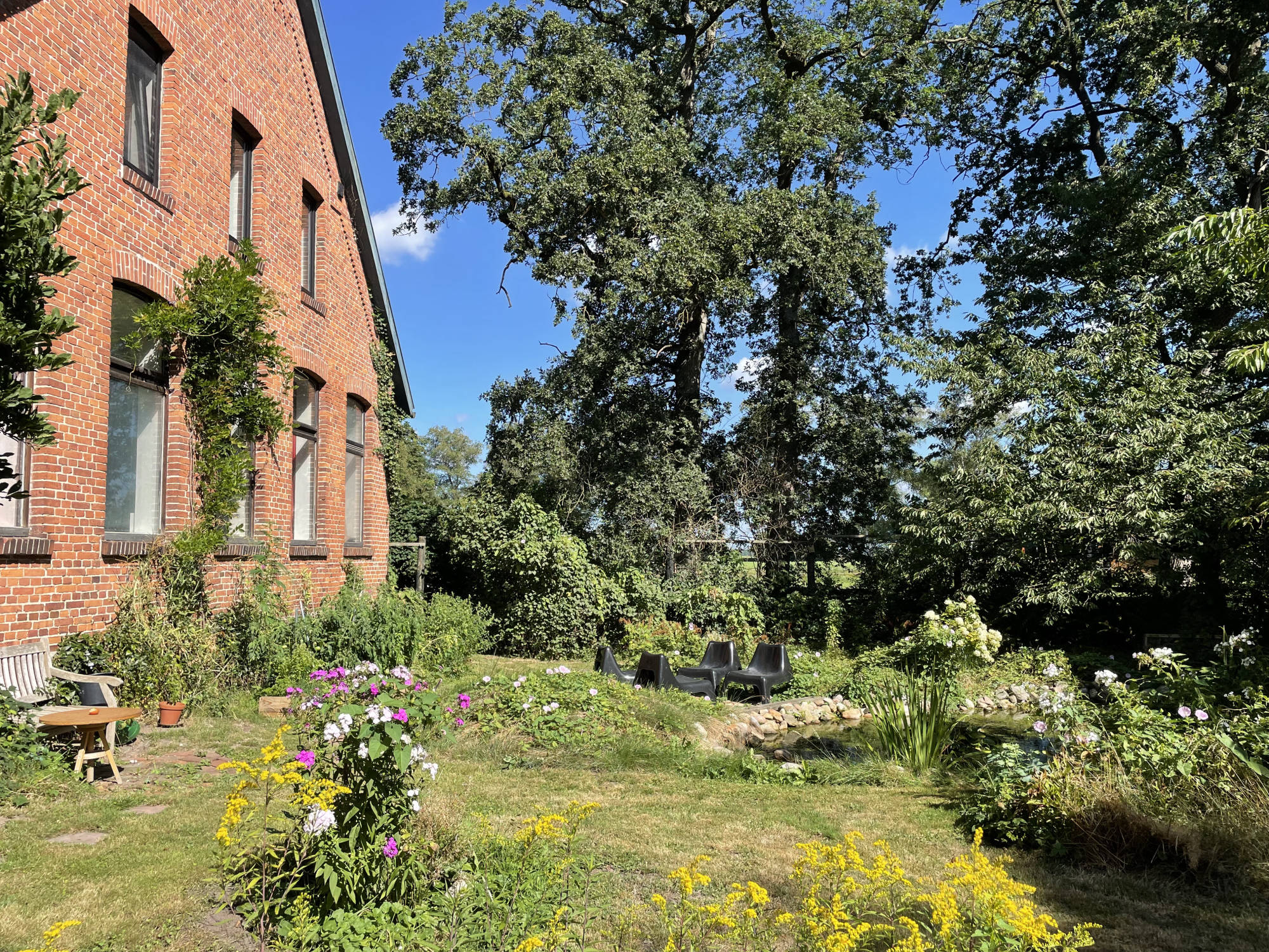 Der alte Baumbestand, welcher das Grundstück umgibt, gehört hauptsächlich den Nachbarn. Auf dem Grundstück selbst befinden sich eine große Kastanie, Birken, Apfel- und Kirschbaum und ein kleines Buschwäldchen. Auch ein kleiner Teich sowie mehrere Sitzbereiche wurden im Laufe der Jahre angelegt.