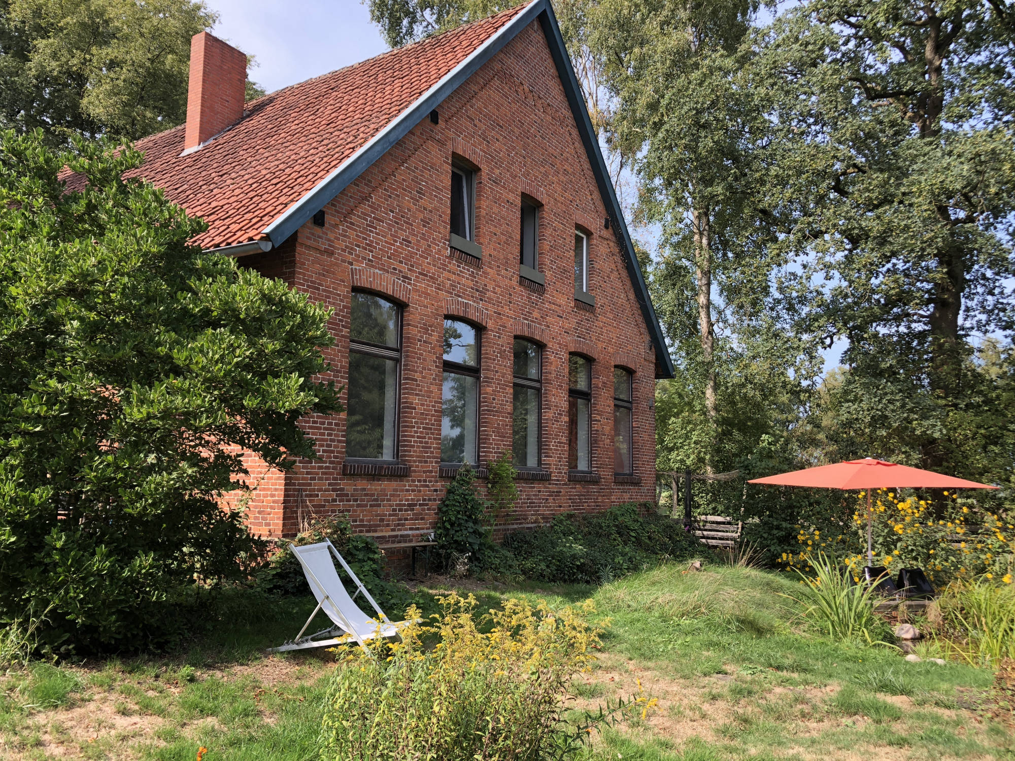 Besonders schön ist das große Wohnzimmer (ca. 50 qm), welches einst das Klassenzimmer der kleinen Dorfschule war, und wirkt mit seiner lichten Deckenhöhe von ca. 3,50 m und den vier großen Fenstern besonders charmant.