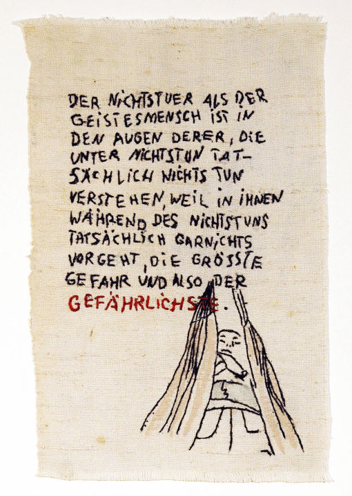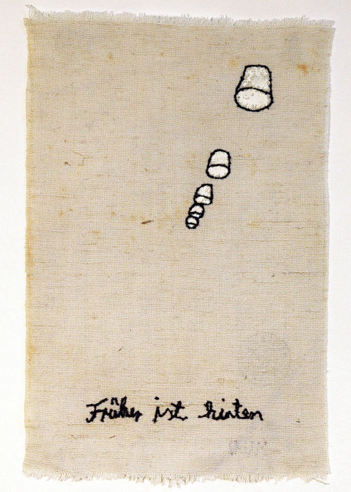 MEMENTO MORI / GEDENKE, DASS DU STERBLICH BIST, 2011, Stickerei mit Schurwolle, Acryl, Jute, 200 x 300 cm, Preis € 16.500