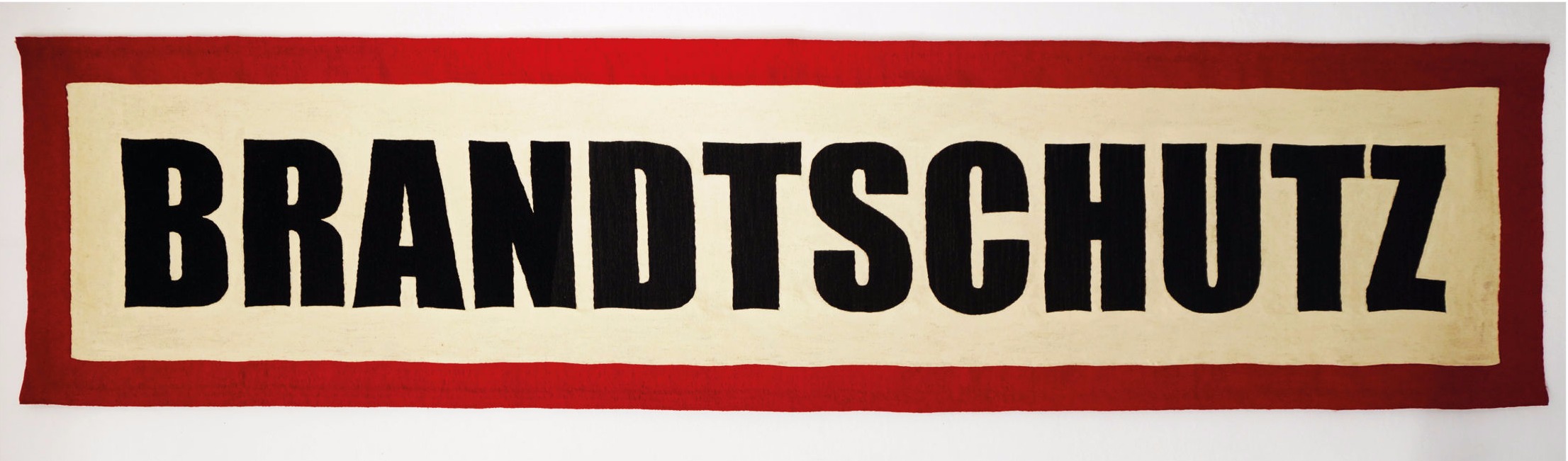 Wer das bisherige Werk von Marie S. Ueltzen kennt, stellt schnell fest, dass es ihr schon immer um die kleinen Geschichten am Rande geht, die für einen einzelnen Menschen so wichtig sein können, aber keine direkte Auswirkung im Äußeren haben. Gleich vorab: Die Arbeit „Brandtschutz / Wahnschild“ besteht aus einem Wort (Brandtschutz), welches auf einen fast vier Meter langen und fast ein Meter breiten Jutestoff mit schwarzer Wolle gestickt wurde. Es hat eine rote, ebenfalls gestickte Umrandung. Die restliche Fläche ist mit einem beigefarbenen oder eher schmutzigen Weiß ausgemalt. Die Buchstaben sind der gängigen Schrift von Warnschildern entlehnt, ebenso entspricht die Optik einem typischen Warnschild, welches wir an zahlreichen Orten finden können, allerdings eher selten, wenn überhaupt, in dieser Dimension. Marie S. Ueltzen überhöht also die Warnung, macht diese noch sichtbarer.